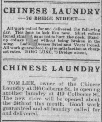 The first Chinese laundry in Brantford, Chong Lee Laundry, opened in 1896. One of the last laundries to be established in the city, James Mark First Class Hand Laundry at 110 Market St., opened in 1952 and operated until 1974.