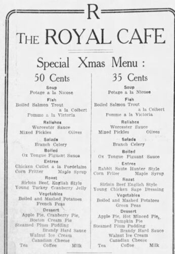 Check out this special Christmas menu from the Royal Cafe! This menu not only showcases the sorts of dishes that were available at Chinese-owned establishments in the city, but also boasts prices that are certainly astonishing by today's standards.